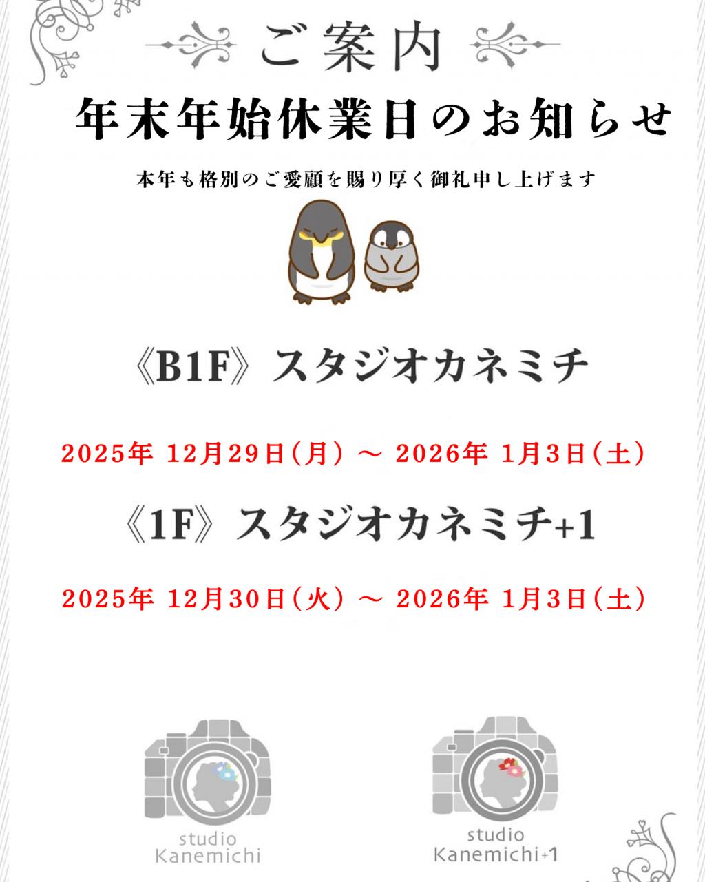 年末年始の休業日のお知らせ2025.12.01年末年始の休業日のお知らせ 本年は格別のご愛顧を賜り厚く御礼申し上げます。 地下1階 スタジオカネミチ 2025年12月29日(月)より2025年1月3日(土)まで 1階 スタジオカネミチ+1 2025年12月30日(火)より2025年1月3日(土)まで 年末年始休業とさせて頂きます。 御迷惑をおかけいたしますが、何卒ご了承くださいますようお願い申し上げます 前へ お知らせ一覧に戻る一覧 次へ
